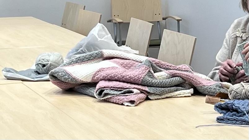 Käsityökerhossa valmistuu syksyn 2025 aikana iso päiväpeitto myyntiin.